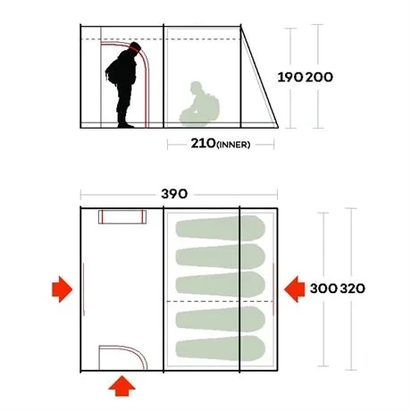 5 kişinin rahatlıkla kullanabileceği konforlu bir alan sunan, geliştirilmiş tasarımıyla güvenliği garanti eden bir üründür. Ağırlık: 13 kg Ölçüler: 65x30x30 cm Hacim: 7,6 m3 Dış tente: 70D diamond polyester, 75 g/ m² , ısı yalıtımlı,poliüretan kaplama, 2000 mm'ye kadar su geçirmezliğe sahip kumaş İç tente: Su itici ve nefes alabilir özellikte polyester kumaş Zemin: 70D polyester, 80 g/m², 2500mm'ye kadar su geçirmezliğe ve su iticiliğe sahip kumaş 3 adet fiberglas pol ve çelik kazıklarla sağlam bir tutuş sağlar Depolama için iç cepler ve havalandırma çıkışları mevcuttur Geniş bir ön giriş, yan ve arkadan birer giriş vardır İç bölümün kapıları cibinliklidir. Lamba asmak için bir kanca, taşıma çantası ve tamir kiti mevcuttur.