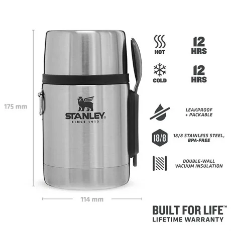 Stanley Adventure Vakumlu Yemek Termosu 0,53 LtStanley Adventure yemek termosu resmen tek kişilik orkestra, siz macera peşindeyken o herşeyi düşünür. 12 saat sıcaklık sağlayan bir yalıtım mı? Tamam. Tam boy kaşık yerine de geçen çatal mı? Tamam. Diğer yiyeceklerinizi kuru tutmak için kapak kısmında ek bölme mi? Tamam. Kesinlikle hepsine tamam.Ürün Özellikleri 18/8 paslanmaz çelik, BPA içermez Çift duvarlı vakum yalıtımı Sızdırmaz Yalıtımlı kapak bardak olarak da kullanılabilir Kolay temizlik için geniş açıklık Kaşık yerine de geçen çatal dahildir.Teknik Özellikleri Ağırlık:520 gr Boyutlar:11.4 x 9.4 x 17,5 cm Sıcak: 12saat Soğuk: 12 Saat EFSANEVİ STANLEY YALITIMI:Her termos entegre kaşala sahiptir; stanley çift duvar vakum yalıtımı ile yiyecekleriniz 12 saate kadar sıcak veya soğuk bir şekilde korur. .HAFİF TASARIMElinize rahatca sığar. İstediğiniz her yere taşıyabilirsinizSIZDIRMAYAN YAPI:Paslanmaz, sızıntı yapmaz, sırt çantanıza rahat sığar; mühürlü kapağı sayesinde dökülme korkusu yaşamazsınız.TEKRAR KULLANILABİLİR & KOLAY TEMİZLENİR:Çatal ve kaşığınızı tek bir ürünle değiştirin, paslanmaz çelikten üretilmiş tekrar kullanılabilen kaşal!ÖMÜR BOYU GARANTİStanley zamana karşı koymak üzere tasarlandı. Bu Stanley'nin size verdiği bir sözdür. "Ömür Boyu Kullanım”, sloganı Stanley'nin 1913'ten beri bir ömür boyu sürecek dayanıklı yiyecek ve içecek saklama aletleri üretme vaadidir. Bugün hala bu sözü tutuyorlar. Stanley ürünleri, üretimden kaynaklanan hatalar, ısı muhafaza problemleri veya akıtma/sızdırma gibi sorunlara karşı ömür boyu garantilidir. Düşme ve çarpma sonucu meydana gelebilecek üründeki her türlü hasar ve hasar nedeni ile oluşabilecek termal kayıplar, sıvı sızdırması ve yine düşme ve çarpma neticesinde ürünün parçalarındaki kırıklar vb ile kullanım, bakım ve temizlik koşullarına uyulmaması gibi durumlar sonrasında iç ve dış yüzeyde oluşabilecek hasarlar, bozulmalar ve paslanma/korozyonlar garanti kapsamına girmemektedir.