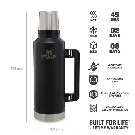 Stanley Klasik Vakumlu Paslanmaz Çelik Termos 1.9 LT Dayanıklılığı ile şöhret yapmış Stanley termos 1,9 lt klasik serisi. Kamptan, pikniğe, şantiyeden seyahate hem hayatını kolaylaştırmak isteyenlerin, hem profesyonellerin hem de seyahat sevenlerin tercihi. Stanley termos Vakum insulasyon ve çift duvar konstrüksiyon sayesinde ısı kaybetmez. Maceranızı tüm gün, tüm gece, hatta devamı sabahında bile sürdürün. Stanley termos 1,9 lt termos paslanmaz çelik gövdesi sayesinde yıpranmaz, rahatlıkla yanınızda taşıyabilirsiniz. Sızdırmadığı ve çok dayanıklı olduğu için ona çok kibar davranmanıza gerek yok. Stanley 1.9 lt termosun çift duvarlı gövdesi 45 saat boyunca sıcak, 48 saat soğuk tutar. Buzlu içeceklerinizi ise 192 saate kadar muhafaza eder . Ağzı geniş olduğu için İçini doldurması ve boşalınca temizlemesi çok kolaydır. 18/8 paslanmaz çelik ve BPA'sız malzemelerle üretilmiştir, sızıntı yapmaz, paslanmaz, kapağı bardak olarak kullanılabilir, ömür boyu garantilidir ve sizi asla yarı yolda bırakmaz. Stanley Termos Ürün Özellikleri 18/8 paslanmaz çelik Çift duvarlı vakum yalıtımı, BPA içermez Daha fazla dayanıklılık için daha dar yalıtım duvarı boşluğu Yerden istifade etmek için katlanabilir tutacak Sızdırma yapmaz ve kolay taşınır Yalıtımlı kapak bardak olarak da kullanılabilir İçeceklerinizi daha kontrollü dökebilmeniz için yeni stoper Stanley Termos Teknik Özellikleri Ağırlık:1130 gr Kapasite: 1.9 Lt Boyutlar: 11,1 X 13,1 X 37,3 cm Sıcak: 45 Saat Soğuk 48 Saat Buzlu İçecekler: 192 Saat DAYANIKLI VE GÜVENLİ: 18/8 paslanmaz çelik yapısı ile performansından hiç bir şey kaybetmeden en zorlu koşullarda bile görevini yerine getirir. Arabada, işte, çadırda, her yerde.. ÇOK AMAÇLI KAPAK: : Stanley termoslarımız sızıntı yapmayan kapaklara sahiptir, dökülme korkusu yaşamadan sırt çantanızda taşıyabilirsiniz. Geniş ağzı sayesinde kolay dökülür, kapağı ise bardak olarak kullanılabilir. TÜM GÜN SÜREN KEYİF: Farklı hacimlere sahip termoslarımız ile bir kere dolumdan sonra tüm gün içeceğinizin keyfini çıkarabilirsiniz. Açılıp kapanan tutacağı ile taşıması da çok kolaydır. ÖMÜR BOYU GARANTİ! Stanley zamana karşı koymak üzere tasarlandı. Bu Stanley'nin size verdiği bir sözdür. "Ömür Boyu Kullanım”, sloganı Stanley'nin 1913'ten beri bir ömür boyu sürecek dayanıklı yiyecek ve içecek saklama aletleri üretme vaadidir. Bugün hala bu sözü tutuyorlar. Stanley ürünleri, üretimden kaynaklanan hatalar, ısı muhafaza problemleri veya akıtma/sızdırma gibi sorunlara karşı ömür boyu garantilidir. Düşme ve çarpma sonucu meydana gelebilecek üründeki her türlü hasar ve hasar nedeni ile oluşabilecek termal kayıplar, sıvı sızdırması ve yine düşme ve çarpma neticesinde ürünün parçalarındaki kırıklar vb ile kullanım, bakım ve temizlik koşullarına uyulmaması gibi durumlar sonrasında iç ve dış yüzeyde oluşabilecek hasarlar, bozulmalar ve paslanma/korozyonlar garanti kapsamına girmemektedir.
