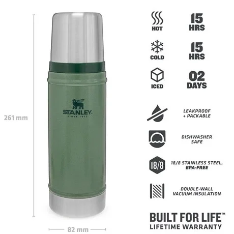 Stanley Klasik Vakumlu Termos 0,47 LtHer yerde sizinle...Stanley Klasik Vakumlu Termos 0,47 lt, serisinin tüm güçlü özelliklerini taşıyor. Bu küçük dayanıklı tank, termal ısısını korurken, düşürmelere, darbelere ve oyulmalara karşı dayanacak şekilde tasarlanmıştır. 0.47 litrelik Efsanevi paslanmaz çelik vakum yalıtımlı termos, içeceklerinizi 15 saat boyunca soğuk ya da sıcak tutar. Yalıtımlı kapağı bardak olarak kullanılabilir. Sızdırmaz ve paslanmazdır. Ömür boyu garantilidir.Stanley Termos Ürün Özellikleri Vakum insülasyon ve çift duvar konstrüksiyon sayesinde ısı kaybetmez. 15 saat boyunca içeceğiniz soğuk ise içilebilir soğuklukta, sıcak ise içilebilir sıcaklıkta kalır. Buzlu içeceklerinizi ise 48 saate kadar soğuk kalmasını sağlar. Ayrıca sızdırmaz. BPA içermez, kanserojen madde yoktur.Stanley Termos Teknik Özellikleri Hacim:0,47 lt Ağırlık:453 gr Boyutlar: 7.7 x 7.7 x 26 cm Yapı: Paslanmaz Çelik Gövde, Yapı: Çift Duvar Yalıtımı BPA: İçermez Sıcaklık & Soğukluk: 15 Saat Buzlu İçecekler: 48 Saat SOĞUK YA DA SICAK:Stanley Classic Vakum Termosumuz, sıcak veya soğuk (çorba, kahve, çay) sıvıları, olması gerektiği ısıda 15 saat boyunca korur. BPA içermeyen maddelerden üretildiği için, gıdaları güvenle tüketebilirsinizDAYANIKLI VE GÜVENLİ18/8 paslanmaz çelik yapısı ile performansından hiç bir şey kaybetmeden en zorlu koşullarda bile görevini yerine getirir. Arabada, işte, çadırda, her yerde.ÇOK AMAÇLI KAPAK:Stanley termoslarımız sızıntı yapmayan kapaklara sahiptir, dökülme korkusu yaşamadan sırt çantanızda taşıyabilirsiniz. Geniş ağzı sayesinde kolay dökülür, kapağı ise bardak olarak kullanılabilir.TÜM GÜN SÜREN KEYİF:Farklı hacimlere sahip termoslarımız ile bir kere dolumdan sonra tüm gün içeceğinizin keyfini çıkarabilirsiniz. Açılıp kapanan tutacağı ile taşıması da çok kolaydır. .ÖMÜR BOYU GARANTİ:Stanley zamana karşı koymak üzere tasarlandı. Bu Stanley'nin size verdiği bir sözdür. "Ömür Boyu Kullanım”, sloganı Stanley'nin 1913'ten beri bir ömür boyu sürecek dayanıklı yiyecek ve içecek saklama aletleri üretme vaadidir. Bugün hala bu sözü tutuyorlar. Stanley ürünleri, üretimden kaynaklanan hatalar, ısı muhafaza problemleri veya akıtma/sızdırma gibi sorunlara karşı ömür boyu garantilidir. Düşme ve çarpma sonucu meydana gelebilecek üründeki her türlü hasar ve hasar nedeni ile oluşabilecek termal kayıplar, sıvı sızdırması ve yine düşme ve çarpma neticesinde ürünün parçalarındaki kırıklar vb ile kullanım, bakım ve temizlik koşullarına uyulmaması gibi durumlar sonrasında iç ve dış yüzeyde oluşabilecek hasarlar, bozulmalar ve paslanma/korozyonlar garanti kapsamına girmemektedir.