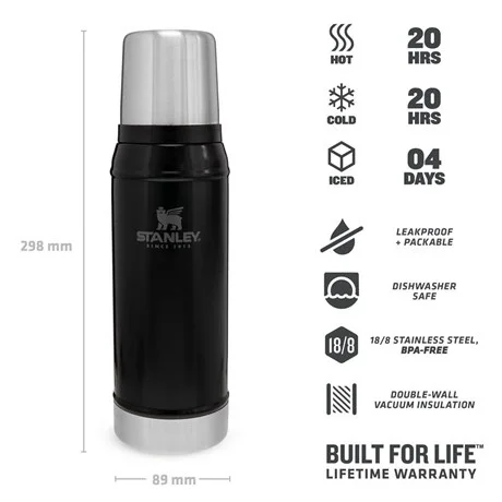 Stanley Klasik Vakumlu Termos 0,75 LtPaslanmaz çelik vakumlu yalıtımın en tepe noktası, çift duvarlı 750 ml hacimli Stanley Classic termos sıcak veya soğuk içecekleri 20 saate kadar, buzlu içecekleri de 4 güne kadar korur. 18/8 paslanmaz çelik ve BPA'sız malzemelerle üretilmiştir, sızıntı yapmaz, paslanmaz, kapağı bardak olarak kullanılabilir, ömür boyu garantilidir ve sizi asla yarı yolda bırakmaz.Ürün Özellikleri 18/8 Paslanmaz Çelik, BPA'sız Çift duvar vakumlu yalıtım Sızıntı yapmaz, çantada kolay taşınır, Daha kontrollü bir döküm deneyimi için yeni stoper Yalıtımlı kapak, bardak olarak da kullanılabilir. Sızıntı yapmaz ve çantada kolay taşınır Bulaşık makinesinde yıkanabilirTeknik Özellikleri Hacim:0,75 lt Ağırlık:481 gr Boyutlar: 8.6 x 8.6 x 30 cm Yapı: Paslanmaz Çelik Gövde, Yapı: Çift Duvar Yalıtımı BPA: İçermez Sıcaklık & Soğukluk: 20 Saat Buzlu İçecekler: 96 SaatSOĞUK YA DA SICAK:Stanley Classic Vakum Termosumuz, sıcak veya soğuk (çorba, kahve, çay) sıvıları, olması gerektiği ısıda 20 saat boyunca korur. BPA içermeyen maddelerden üretildiği için, gıdaları güvenle tüketebilirsinizDAYANIKLI VE GÜVENLİ18/8 paslanmaz çelik yapısı ile performansından hiç bir şey kaybetmeden en zorlu koşullarda bile görevini yerine getirir. Arabada, işte, çadırda, her yerde.ÇOK AMAÇLI KAPAK:Stanley termoslarımız sızıntı yapmayan kapaklara sahiptir, dökülme korkusu yaşamadan sırt çantanızda taşıyabilirsiniz. Geniş ağzı sayesinde kolay dökülür, kapağı ise bardak olarak kullanılabilir.TÜM GÜN SÜREN KEYİF:Farklı hacimlere sahip termoslarımız ile bir kere dolumdan sonra tüm gün içeceğinizin keyfini çıkarabilirsiniz. Açılıp kapanan tutacağı ile taşıması da çok kolaydır. .ÖMÜR BOYU GARANTİ:Stanley zamana karşı koymak üzere tasarlandı. Bu Stanley'nin size verdiği bir sözdür. "Ömür Boyu Kullanım”, sloganı Stanley'nin 1913'ten beri bir ömür boyu sürecek dayanıklı yiyecek ve içecek saklama aletleri üretme vaadidir. Bugün hala bu sözü tutuyorlar. Stanley ürünleri, üretimden kaynaklanan hatalar, ısı muhafaza problemleri veya akıtma/sızdırma gibi sorunlara karşı ömür boyu garantilidir. Düşme ve çarpma sonucu meydana gelebilecek üründeki her türlü hasar ve hasar nedeni ile oluşabilecek termal kayıplar, sıvı sızdırması ve yine düşme ve çarpma neticesinde ürünün parçalarındaki kırıklar vb ile kullanım, bakım ve temizlik koşullarına uyulmaması gibi durumlar sonrasında iç ve dış yüzeyde oluşabilecek hasarlar, bozulmalar ve paslanma/korozyonlar garanti kapsamına girmemektedir.